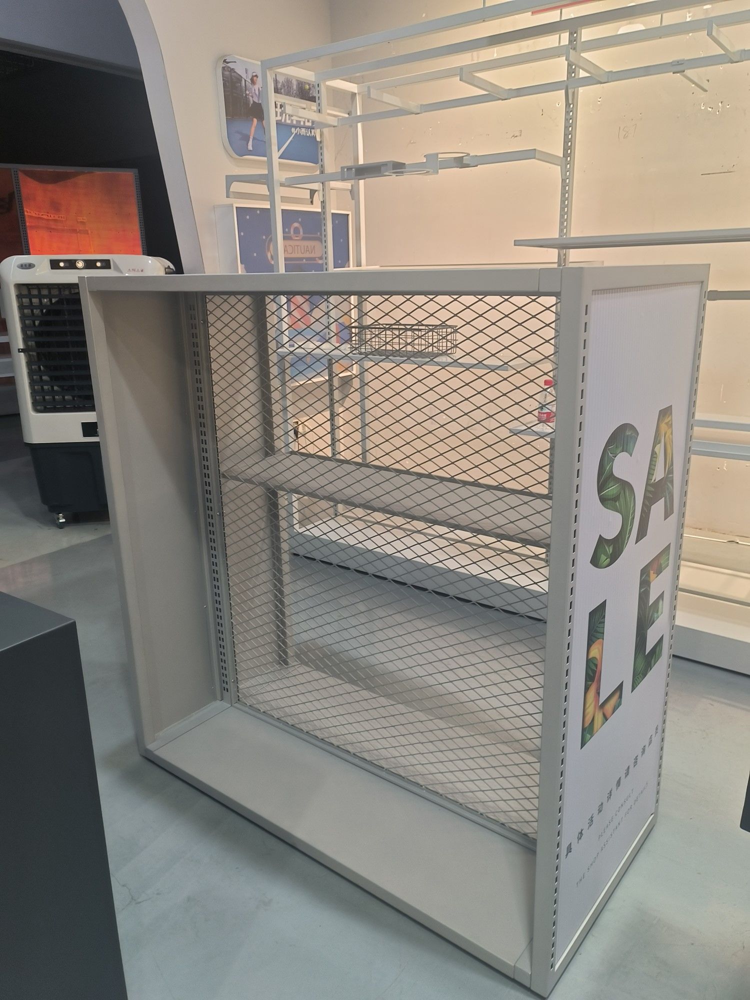 Industrial Mesh Backdrop: The precision-woven steel mesh rear panel offers a sleek, modern texture. Its functional design allows for the easy attachment of hooks, brackets, or secondary branding elements for multi-layered displays.